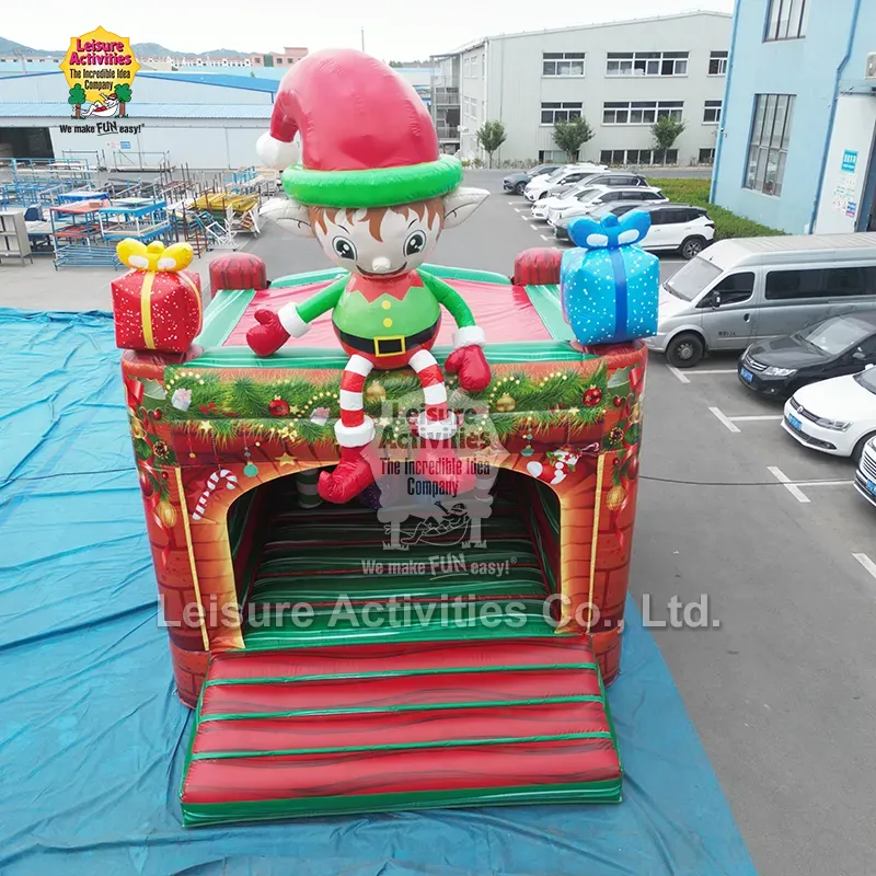 Super Inflatable Bouncy Castles Elf: "The Elf's Christmas Wonderland" . Nagtatampok ang inflatable bouncy castle na ito ng disenyong may temang Pasko sa klasikong pula at berdeng scheme ng kulay. Ang tuktok ay pinalamutian ng isang manika ng duwende at mga kahon ng regalo, habang ang pasukan ay hugis fireplace. Sa loob, may kasama itong malalaking inflatable candy cane, gift box, at festive Christmas tree at fireplace na likhang sining, na lumilikha ng magkakaugnay na kapaligiran sa paglalaro sa holiday.